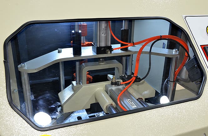 Automated surface cleaning and deburring for welded PVC profile corners.